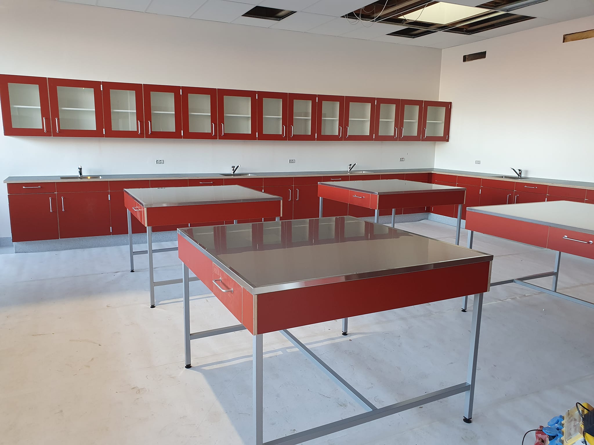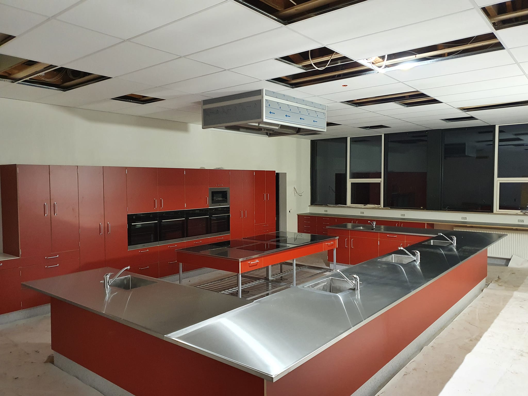 Nye hjemkundskabslokaler til Dronninglund Skole med inventar i den flotte røde farve MAT Paprika og stålbordplader der skinner.