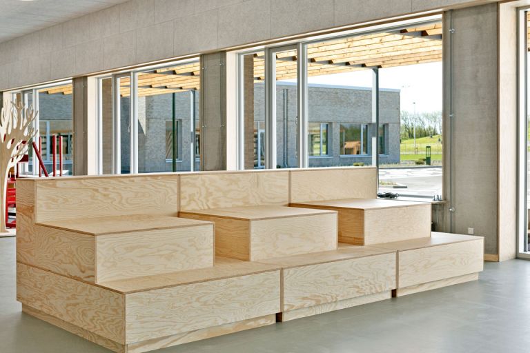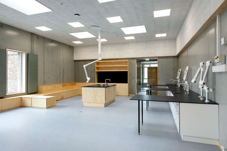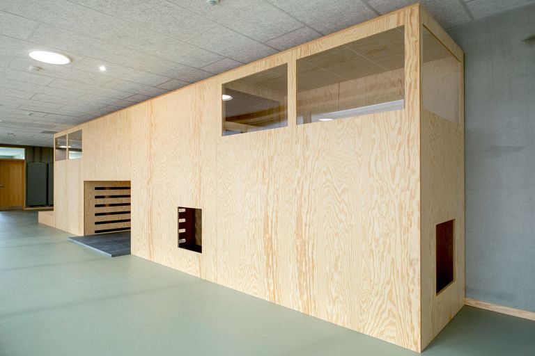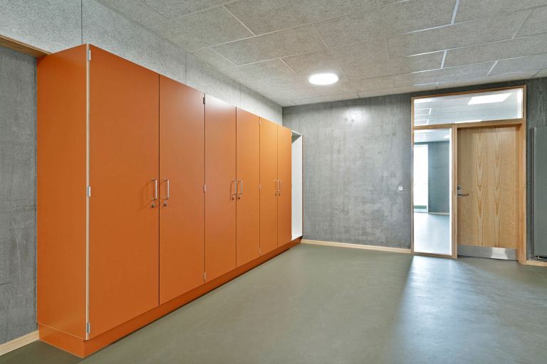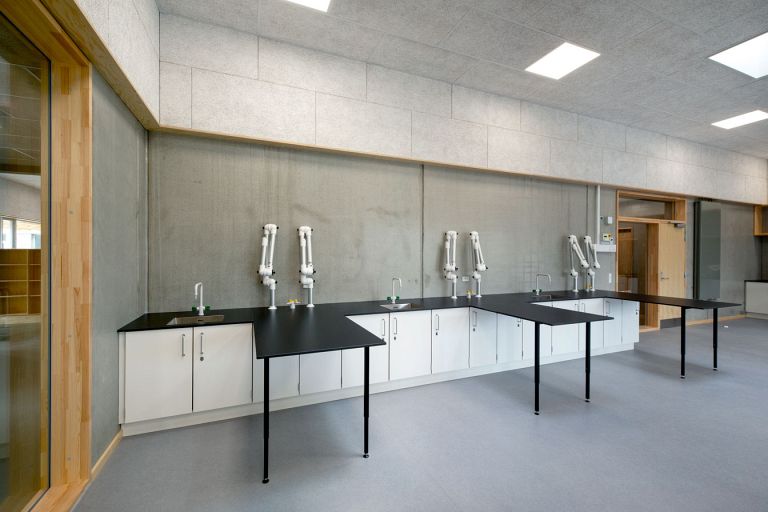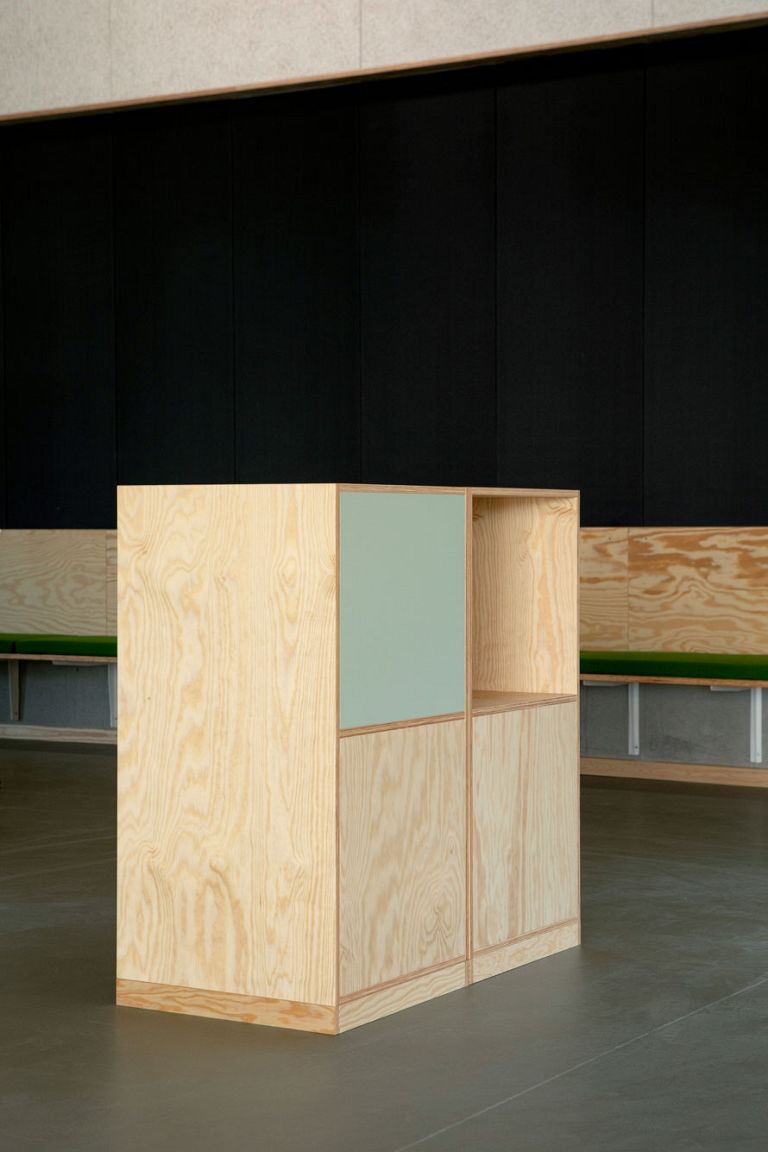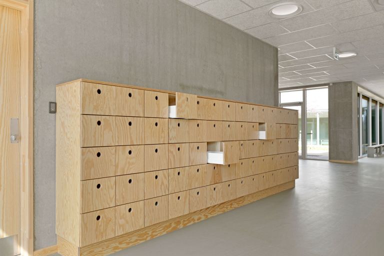 Inventarløsninger leveret til Jetsmark skole bl.a. podier, faglokaler og flotte løsninger i krydsfinér.